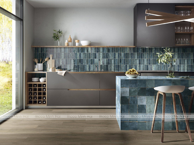 Bạn có thể sử dụng gạch xanh để ốp khu vực tường sau bếp nấu, quầy bar, hoặc bàn đảo. Gạch mosaic, gạch vảy cá hay gạch lục giác màu xanh biển đều là những mẫu gạch được yêu thích trong không gian bếp. Gạch xanh nước biển giúp căn bếp trở nên sáng sủa và sinh động. Kết hợp với ánh sáng trắng và nội thất đơn giản, phòng bếp sẽ trở thành nơi lý tưởng để cả gia đình sum họp.