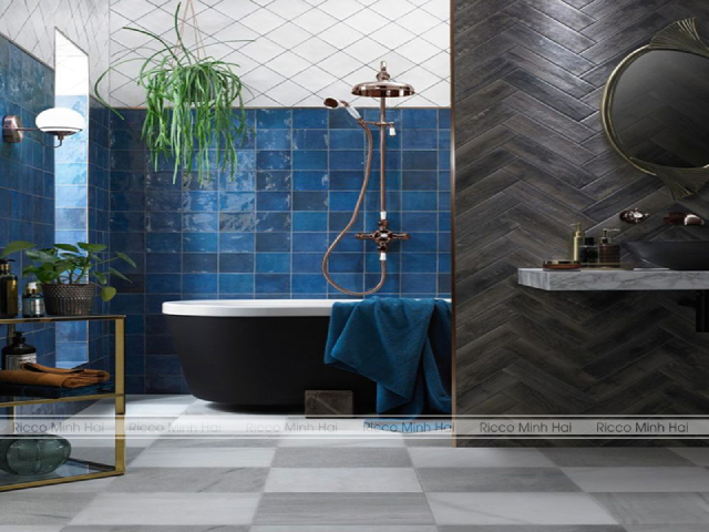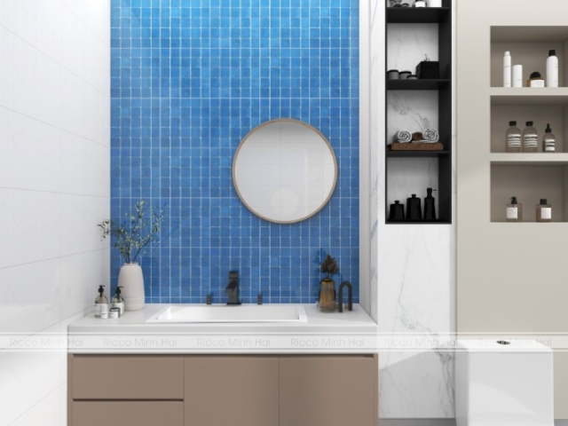 Phòng tắm là nơi bạn cần sự thư giãn và riêng tư. Gạch màu xanh nước biển mang đến cảm giác sạch sẽ, thoáng đãng và tạo liên tưởng đến đại dương. Có thể khẳng định, gạch ốp lát màu xanh nước biển cực kỳ phù hợp với không gian này. Bạn có thể sử dụng gạch xanh để ốp tường khu vực vòi sen, bồn tắm hoặc lavabo. Các mẫu gạch mosaic xanh, gạch vân sóng hoặc gạch giả đá màu xanh biển đều tạo điểm nhấn nổi bật. Kết hợp gạch xanh nước biển với gương tròn, đèn ánh sáng vàng và cây xanh sẽ giúp phòng tắm đúng chuẩn không gian thư giãn tại gia.
