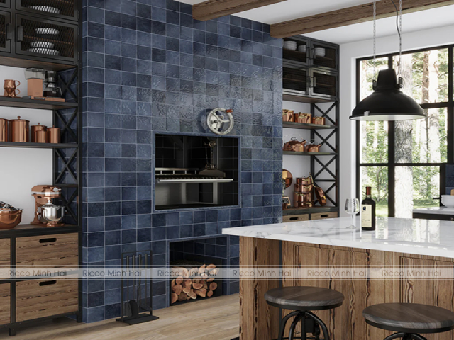 Mẫu gạch ốp tường màu xanh biển đậm giúp không gian thêm phần sang trọng