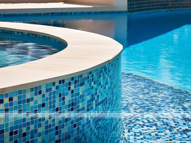 Khi nhắc đến khu vực hồ bơi, không thể bỏ qua gạch xanh nước biển. Màu xanh phản chiếu ánh sáng, tạo hiệu ứng mặt nước trong xanh và sâu hơn – rất được ưa chuộng ở các biệt thự, resort hay nhà phố cao cấp. Gạch mosaic xanh là loại gạch phổ biến nhờ khả năng chống thấm, chống trơn và bền màu. Bạn có thể phối nhiều sắc độ xanh khác nhau để tạo hiệu ứng chuyển màu độc đáo. Việc lựa chọn gạch xanh nước biển cho bể bơi không chỉ đảm bảo tính thẩm mỹ mà còn nâng tầm giá trị cho tổng thể công trình.