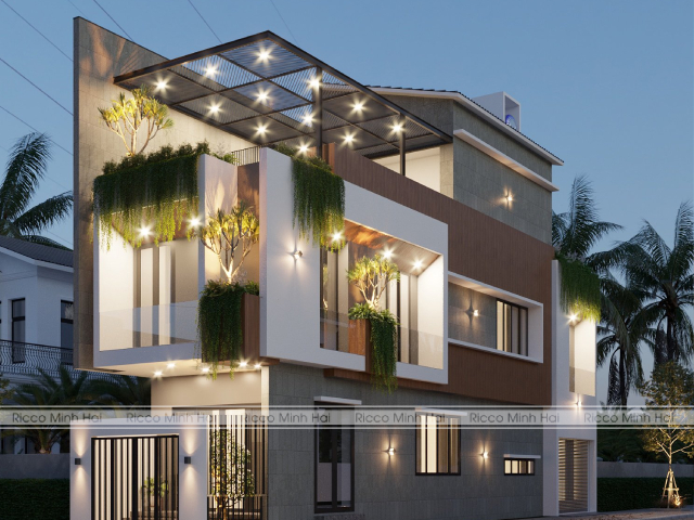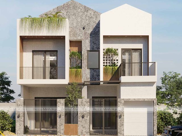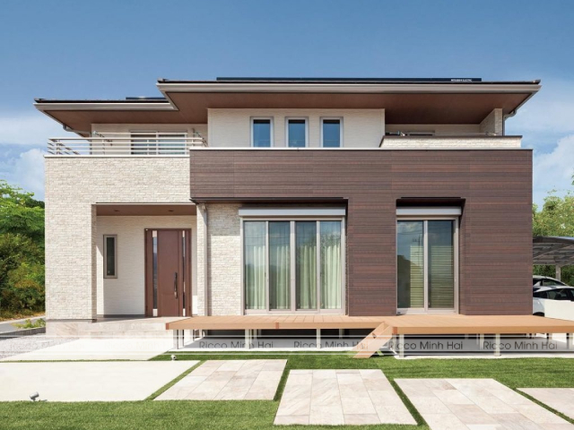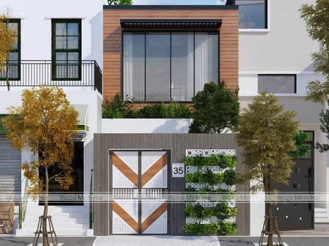 Có thể sử dụng gỗ ở phần ốp trần hiên, khung cửa, hoặc các lam chắn nắng, trong khi gạch đảm nhiệm phần tường chính. Sự đan xen giữa hai vật liệu giúp mặt tiền không bị đơn điệu mà vẫn giữ được vẻ sang trọng.