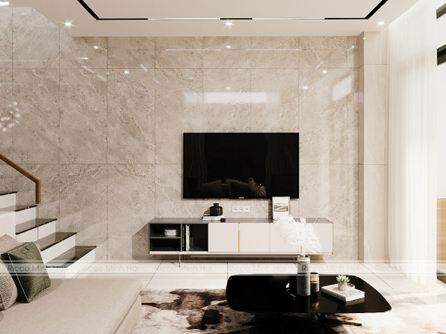 Kích thước gạch phù hợp với các nhà phố 600x600mm hoặc 600x1200mm. Gạch khổ lớn giúp giảm đường ron, tạo cảm giác liền mạch và sang trọng hơn cho tường phòng khách.