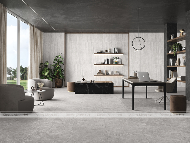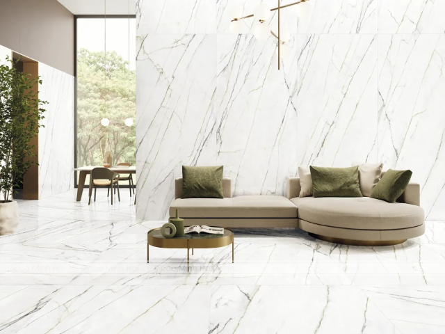 Kích thước gạch phù hợp với phòng khách biệt thự là 600x1200mm, 800x800mm hoặc 1200x1200mm. Gạch kích thước lớn tạo hiệu ứng thị giác mạnh, giúp mảng tường trở nên hoành tráng và đẳng cấp.