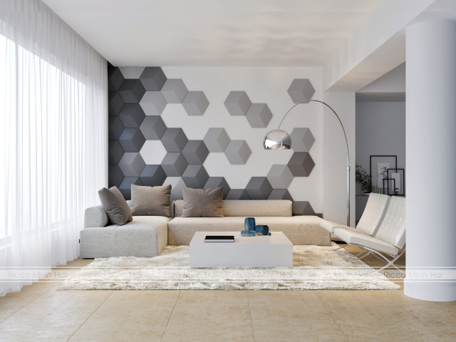 Không gian phòng khách trong căn hộ chung cư thường không quá rộng. Do đó, chọn gạch ốp tường phòng khách chung cư nên ưu tiên màu sắc nhẹ nhàng, sáng sủa để “ăn gian” diện tích. Gạch tông trắng, be hoặc xanh pastel là những gợi ý hoàn hảo.