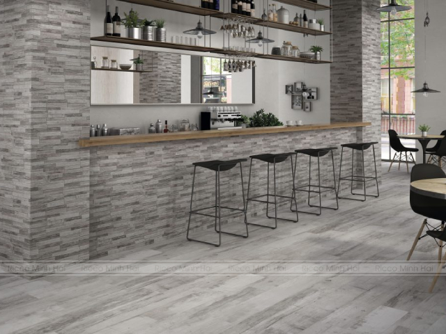 Gạch vân gỗ tone xám trung tính được sử dụng tại quán cafe