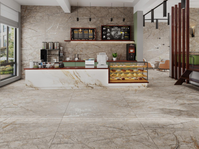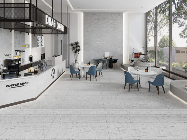 Gạch lát nền quán cafe giả đá luôn nằm trong top lựa chọn phổ biến nhờ vẻ đẹp sang trọng và hiện đại. Với công nghệ sản xuất ngày càng tiên tiến, các mẫu gạch giả đá có đường vân tự nhiên, giống đá thật như marble hay granite. Tông màu trung tính như trắng, xám, be giúp không gian trở nên sáng và dễ phối nội thất. Ngoài tính thẩm mỹ, loại gạch này còn có độ cứng cao, chịu lực tốt, phù hợp với quán có lượng khách đông. Đây là giải pháp tối ưu nếu muốn nâng tầm không gian quán cafe mà vẫn tiết kiệm chi phí.
