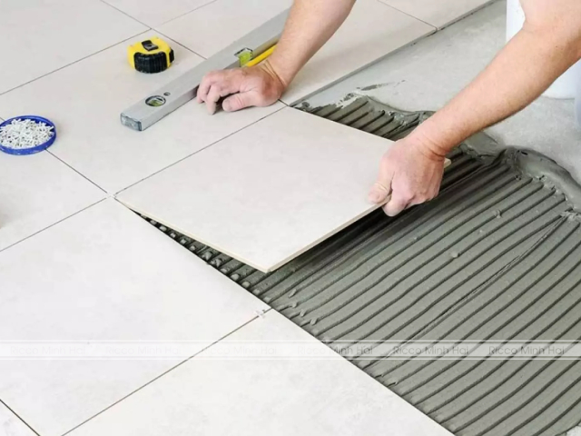 Lớp vữa dán gạch cần được thi công đều và mịn để đảm bảo các viên gạch được cố định chắc chắn. Lớp vữa dán quá dày hoặc quá mỏng sẽ ảnh hưởng đến độ bám dính của gạch và có thể dẫn đến việc gạch bị lệch hoặc nứt sau một thời gian sử dụng. Sử dụng bay răng cưa để trải lớp vữa đồng đều trên mặt nền. Sau đó ấn gạch vào đúng vị trí đã xác định trước.