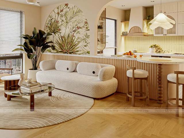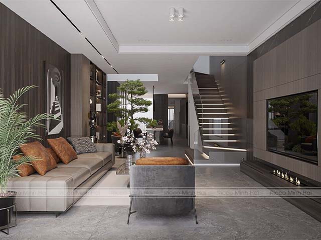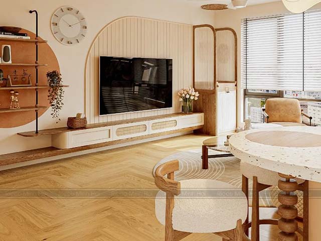 Phòng khách được lát sàn giả gỗ sang trọng, ấm áp